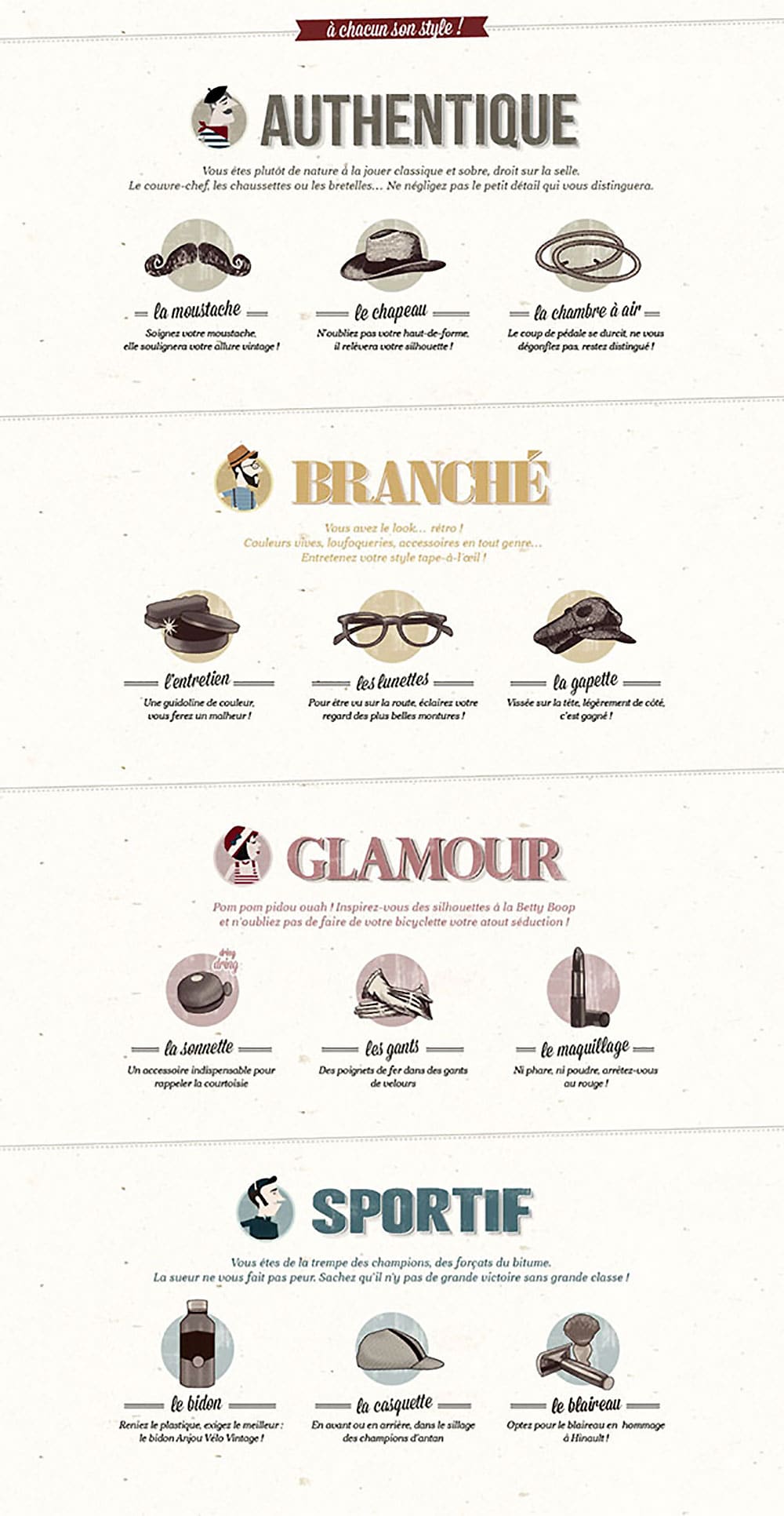 La particularité de l’Anjou Vélo Vintage est son dress code, quelque soit votre style, vous devrez accorder votre tenue, et votre allure en fonction de votre vélo, qu’il soit un singlespeed, un pignon fixe ou tout autre monture. Ci-dessous, quelques exemples.