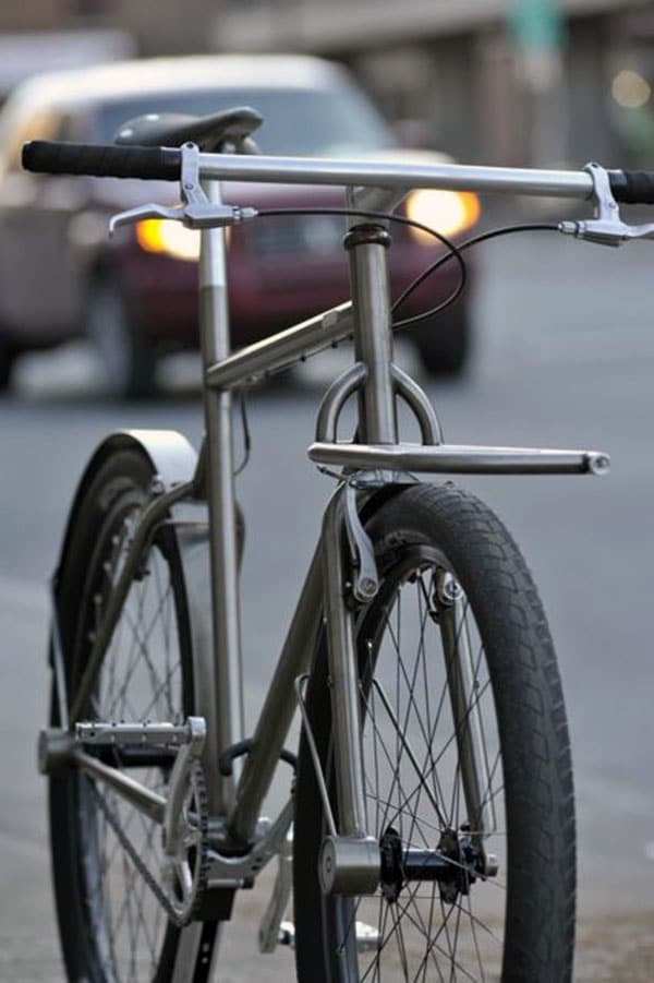 Principalement, il s’agit de nouveaux standards de production. Bien que la géométrie du cadre en acier soit assez particulière, en ce qu’elle combine certaines caractéristiques des vélos de montagne et d’autres des vélos de route, sa forme générale est très classique. Le cadre en diamant reste encore la meilleure forme qu’on ait trouvée pour produire un vélo. C’est dans les détails que le concept innove. Il s’agit d’un single speed en acier Colombus Zona,avec des roues de 26″ pour un poids de 12kg pour le moment. Nous croyons pouvoir potentiellement réduire un peu le poids en production, en fonction du montage que le client désirera. La bicyclette intègre tous les accessoires essentiels. La selle et sa tige, comme le guidon et la potence sont protégés du vol par la présence des roues, qui elles-mêmes sont verrouillées en place par une serrure à clé unique. Ainsi il suffit d’attacher le cadre avec un petit cadenas (inclus dans le concept) et on peut laisser son vélo à l’extérieur sans crainte de le voir dépouillé de ses pièces. Le porte-bagages est quant à lui situé à l’avant, ce qui équilibre les masses du bagage et de l’usager sur les deux roues. Le porte-bagage est indépendant de la fourche, de sorte que le poids repose sur le cadre. Quand on tourne le guidon, le porte-bagage reste droit, ce qui donne beaucoup de stabilité au vélo lorsqu’il est chargé. Il y a aussi un gros travail de simplification de la mécanique qui a été fait. Tout ça à été produit ici même à Montréal, dans les ateliers de l’université et avec un artisan. Puisque nous fabriquons localement et que nous souhaitons mettre en valeur le travail de l’artisan, nous avons choisi une finition transparente pour laisser voir la trace de son labeur.