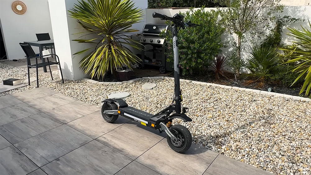 Avec ses suspensions à ressorts avant et arrière, cette trottinette offre un confort rarement vu dans sa catégorie. Les vibrations sont absorbées efficacement, et la position de conduite reste agréable grâce à un guidon large de 68 cm et des poignées ergonomiques avec repose-paumes. Sur route comme en tout-terrain, la stabilité est au rendez-vous.
