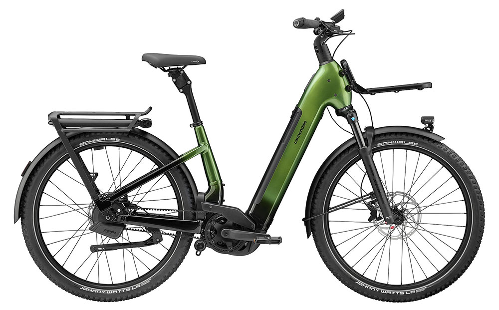 Cannondale a pensé chaque détail. Le vélo dispose de garde-boue en aluminium, d’un porte-bagage arrière pouvant supporter 27 kg avec antivol intégré, et d’un porte-bagage avant OutFront acceptant jusqu’à 15 kg. Les inserts permettent d’ajouter un porte-gourde ou un antivol supplémentaire. L’éclairage avant et arrière reste allumé en permanence, ce qui augmente la visibilité. Le poste de pilotage accueille un cintre moustache large de 68 cm, des poignées ergonomiques et un écran couleur Bosch Kiox 300 inclinable, riche en informations.