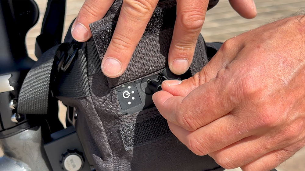 Le Engwe Zip repose sur un concept modulaire génial. En effet, tu peux choisir de l’utiliser comme un vélo musculaire ultra-léger ou de profiter de son assistance électrique. Tout se joue dans le sac amovible situé à l’avant du guidon. Mais la véritable claque technologique réside dans son système de charge unique au monde :